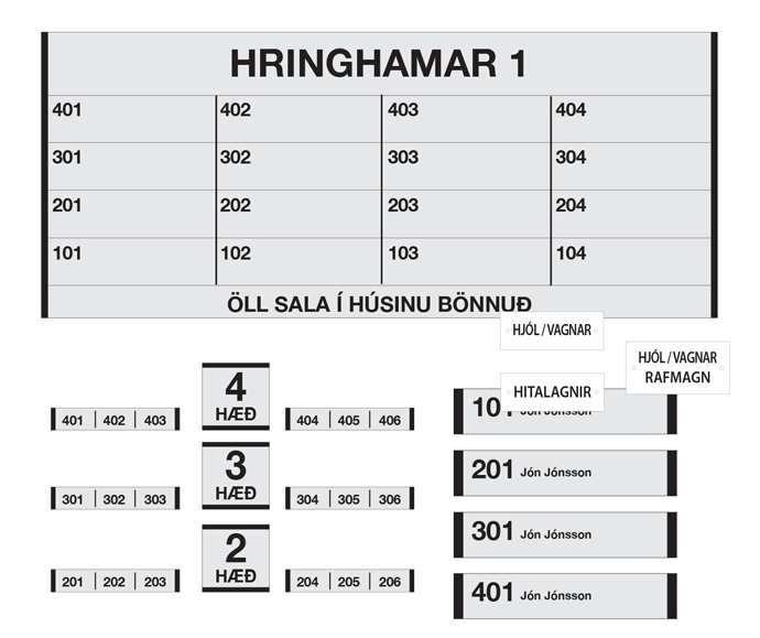 Best er að nota samræmt merkingakerfi fyrir anddyri, póstkassa, geymslur og bílastæði. Það tryggir betra skipulag og einfaldar daglega notkun fyrir íbúa og gesti.