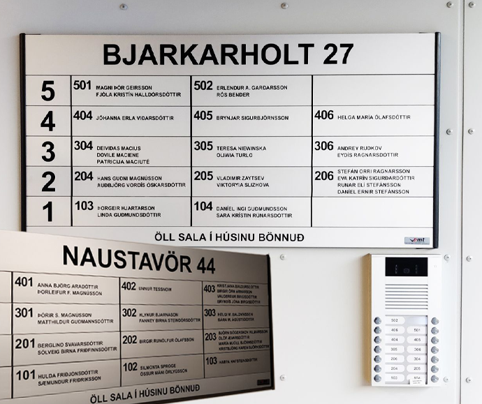 Einnig sérmerkt skilti fyrir íbúðanúmer eða fyrirtæki.