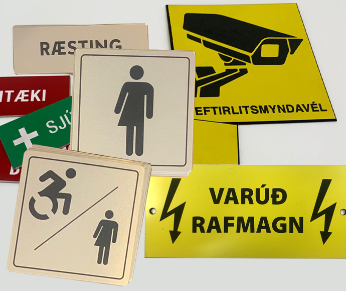 Skiltin eru framleidd úr hágæða plasti og áli og henta jafnt fyrir daglega notkun sem og krefjandi umhverfi. Við framleiðum meðal annars leiðisskilti, fjöldaskilti, vélamerki, eldvarnarmerki og sérmerkt skilti fyrir t.d. sameignir. Við bjóðum einnig upp á sérsmíði sem fellur að umhverfi og notkun.